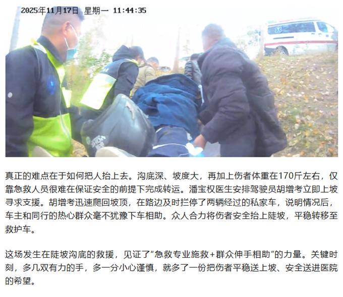 骑车坠落七米深沟,急救沟底固定止血,热心群众合力抬人上堤