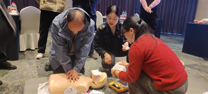 本次培训采用理论授课、现场演示和实操演练相结合的方式进行。殷加玲讲师首先通过自身经历的危急案例,向学员们阐述了人人学习急救的重要性和必要性。随后,她详细介绍了烧烫伤处置、溺水急救、中毒处理、止血、包扎、骨折固定、成人及婴幼儿心肺复苏,以及自动体外除颤仪(AED)的使用等急救理论和施救技巧。