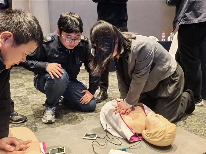 在实操演练环节,培训老师逐一演示了止血带包扎、气道异物梗阻的腹部冲击法(海姆立克手法)、心肺复苏术等急救技能。演示结束后,现场学员两两分组,在培训老师的指导下,利用心肺复苏模型进行了胸外按压和AED配合的双人急救演练。