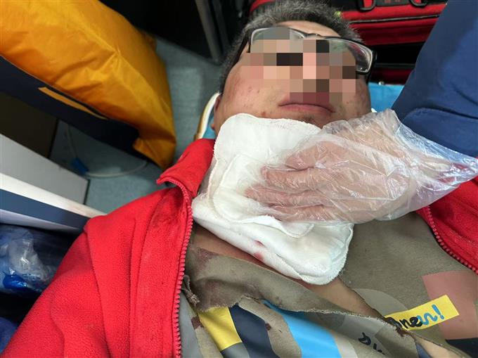 近日,我市某小区传来一声惊呼,正在装修的张师傅因操作不慎,导致小切割机从手中滑落,划过右侧颈部至胸部,造成一条长达15厘米、又深又长的伤口。接到报警后,急救张玉涛班组立即前往救援。