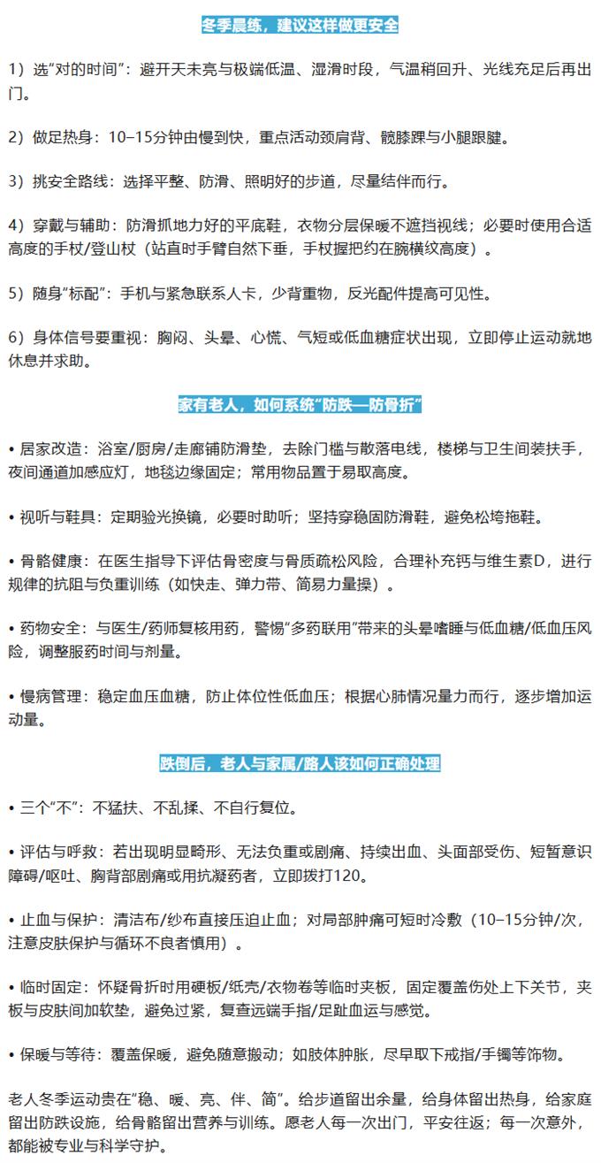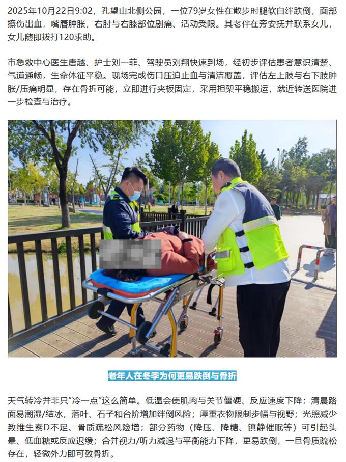 老人孔望山晨练摔倒,急救及时稳处置,冬季防骨折这样做