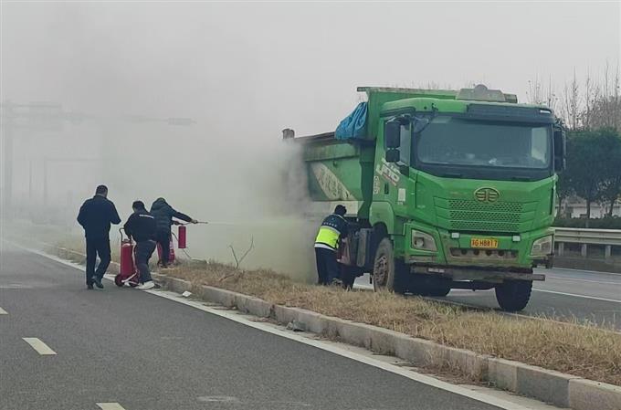 起火车辆为一辆空载重型自卸车,初步了解为车辆线路老化导致后尾灯部位自燃,并进一步引燃后轮胎。由于着火点距离油箱极近,危险系数显著升高。为阻断火势扩大,急救驾驶员武心浩立即奔向加油站借用手提灭火器和推车式灭火器,三名急救人员按照日常消防演练流程协同开展灭火操作。在持续喷射灭火剂并配合随后赶到的消防力量共同处置下,现场火势在约15分钟内被完全扑灭,未造成人员伤亡,避免了可能带来的更大损失。